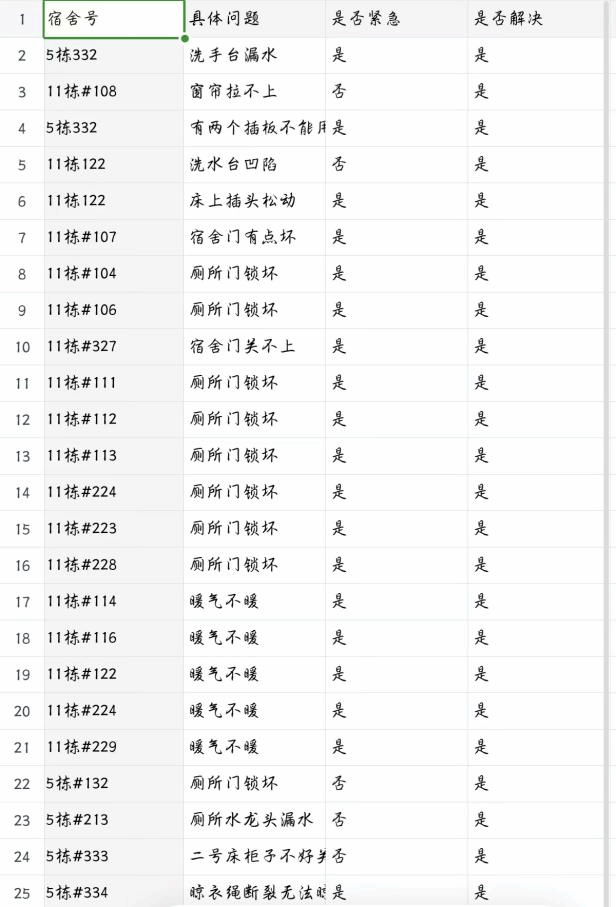部门将收集到的问题系统梳理,整合汇总为包含宿舍编号及对应问题的代办事项明细表,为后续联合后勤部门分类推进处置、高效解决各类宿舍问题提供清晰指引,确保诉求件件有回音。